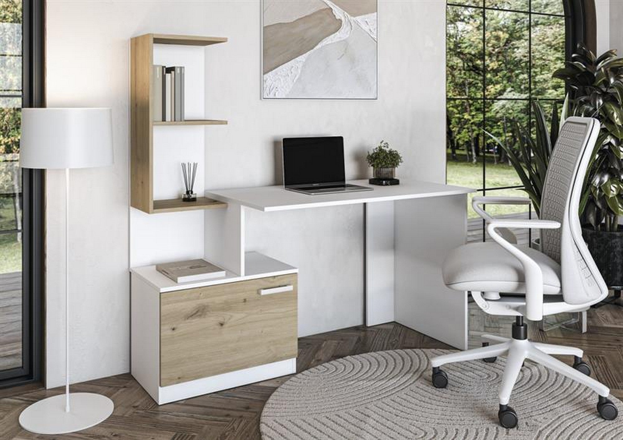 Birou MISO, alb/stejar artisan, PAL laminat, 144x60x142 cm
