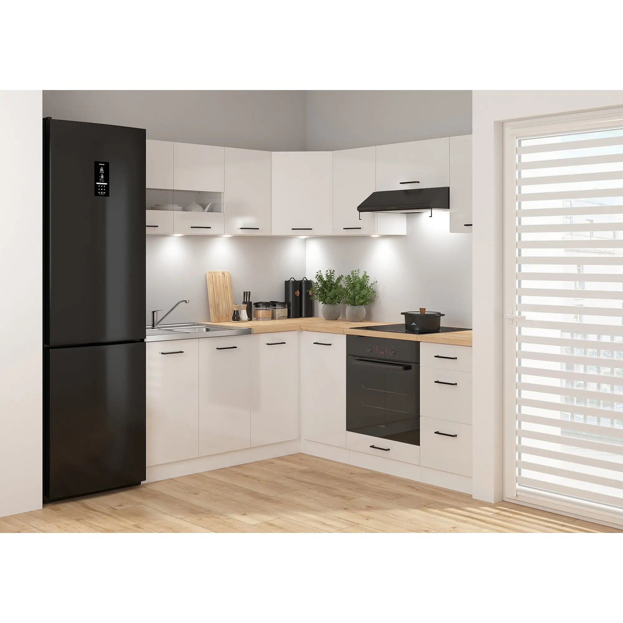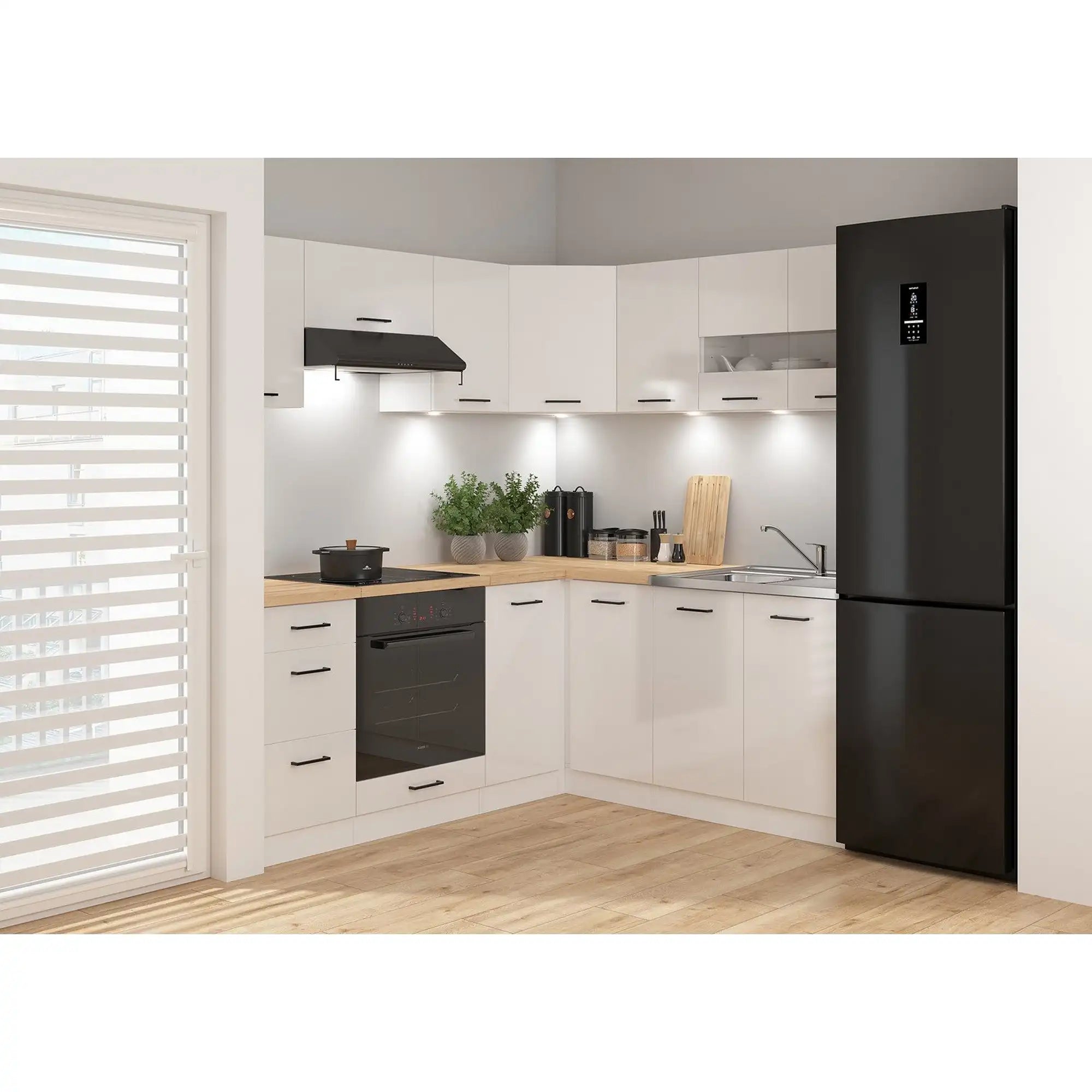 Set bucatarie JUNONA LINE, alb lucios, PAL, 180x200 cm, cu blat stejar artisan