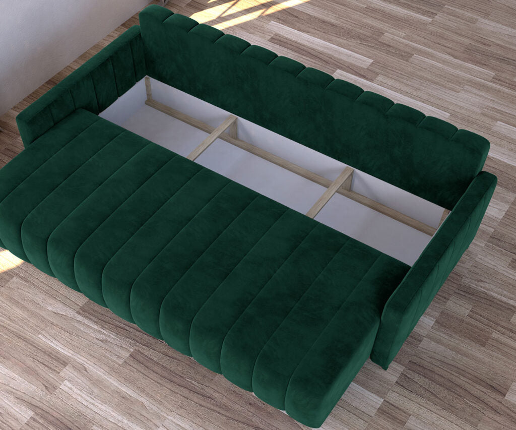 Canapeaua este prevazuta cu lada de depozitare sub sezut si poate fi accesata prin glisarea sezutului catre inainte.