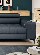 Coltar BAGGIO, sezlong dreapta, stofa catifelata albastra - Salvador 11, 280x196x76/100 cm, reglaj electric, incarcator wireless, lada depozitare, tetiere reglabile