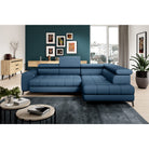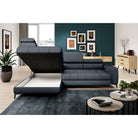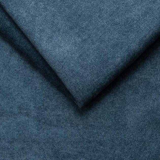 Coltar BAGGIO, sezlong dreapta, stofa catifelata albastra - Whisper 12, 280x196x76/100 cm, reglaj electric, incarcator wireless, lada depozitare, tetiere reglabile