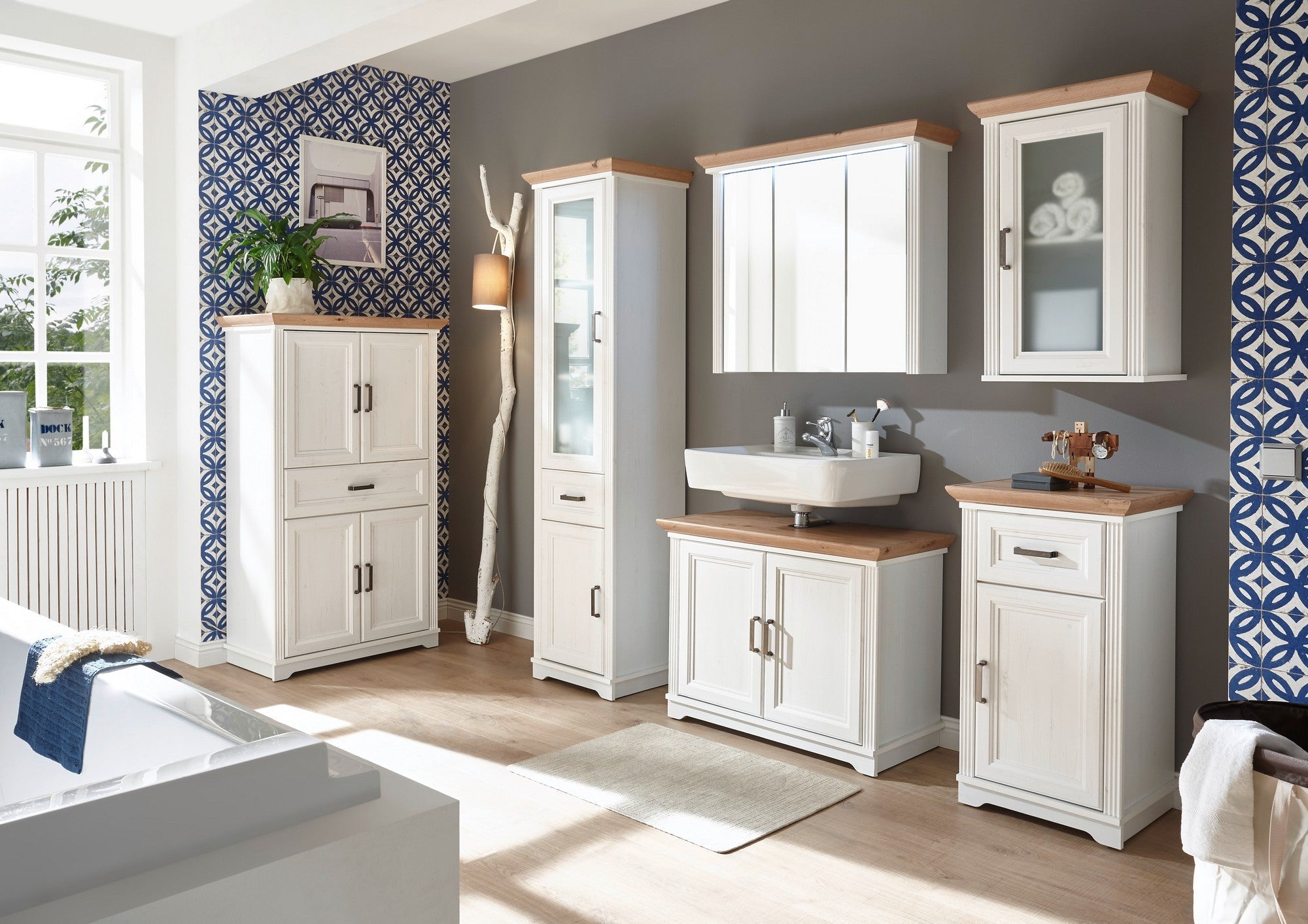 DULAP BAIE SUSPENDAT JASMIN, ALB/STEJAR ARTISAN, PAL, CU O USA, 48X33X76 CM