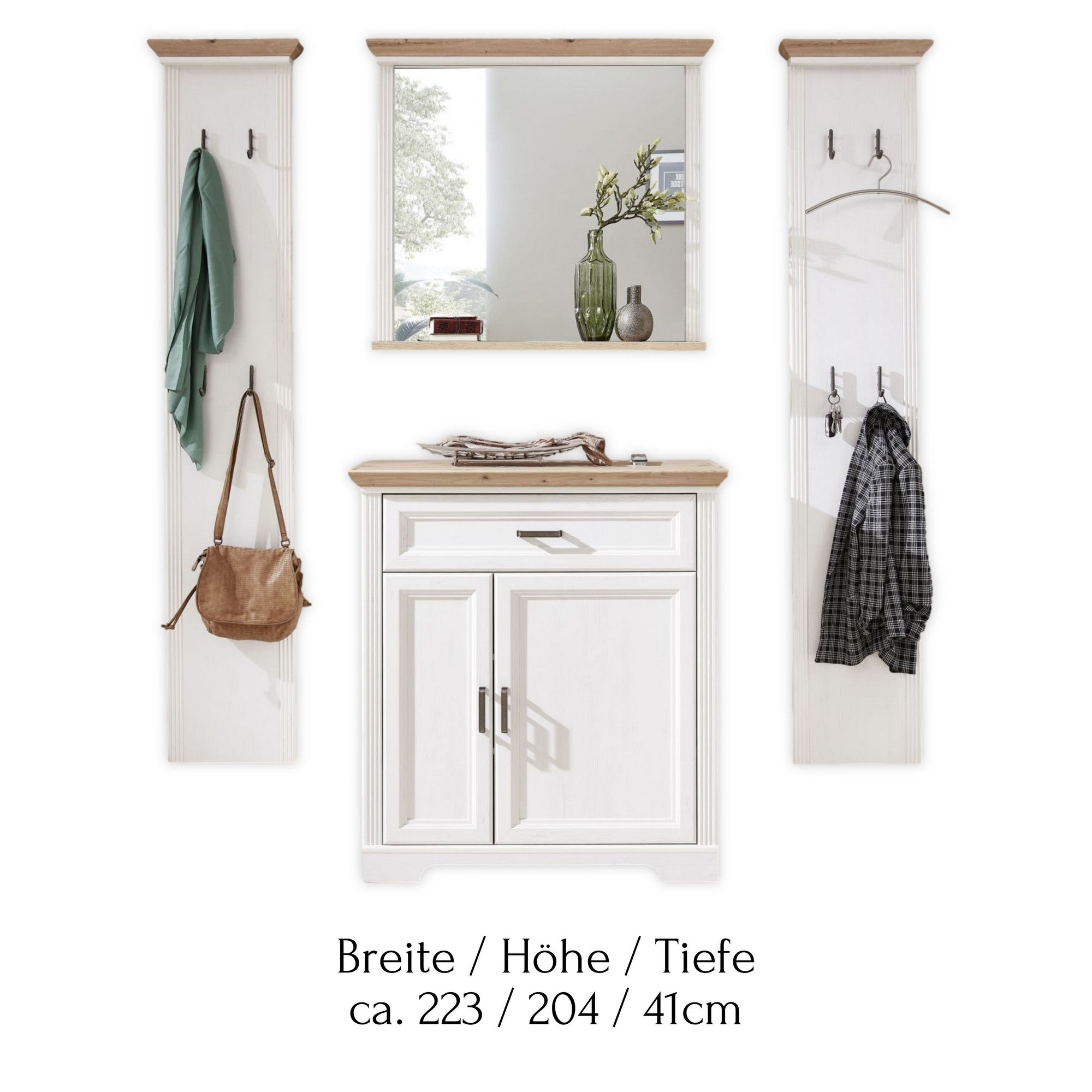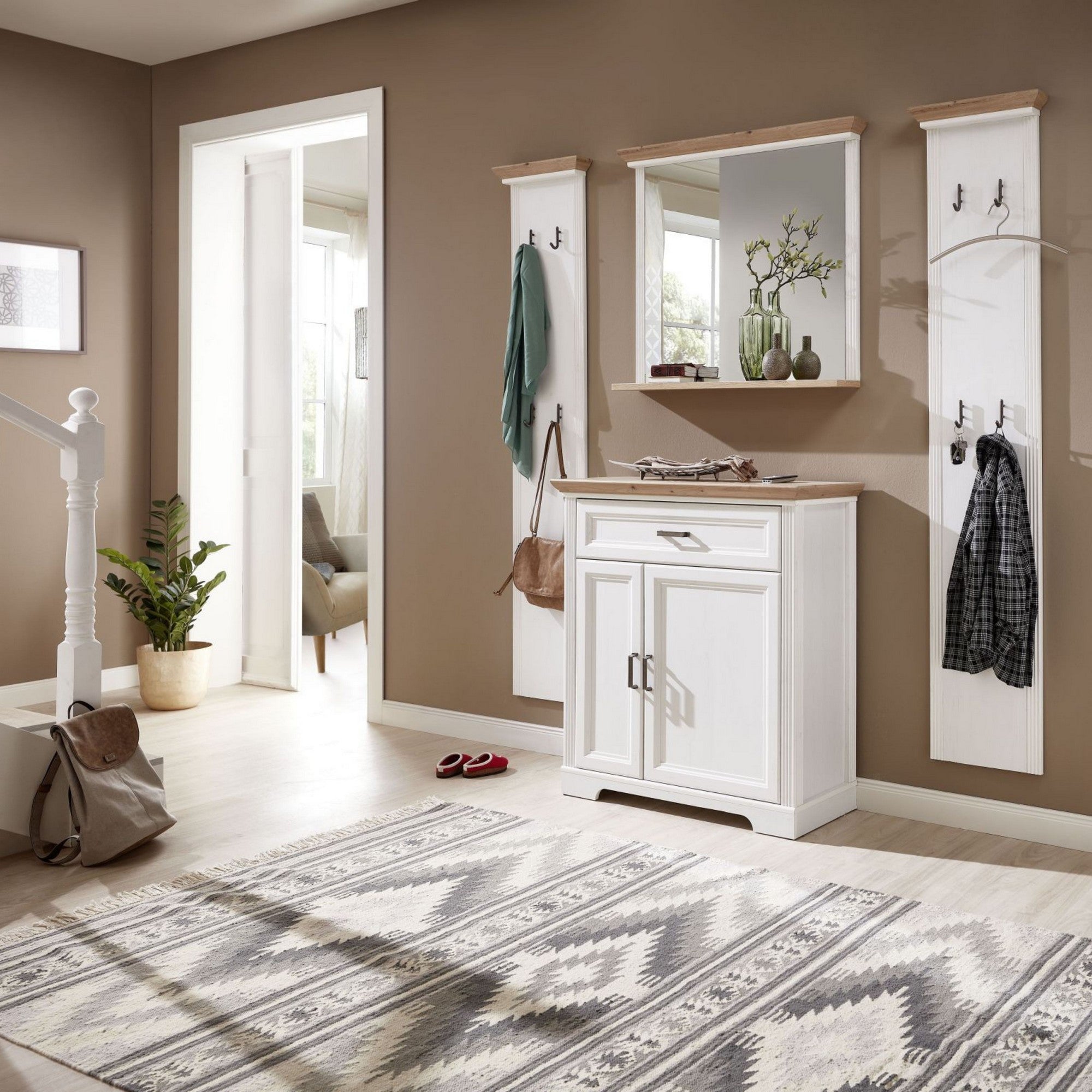 SET MOBILIER PENTRU HOL JASMIN 1, ALB/STEJAR ARTISAN, PAL, FORMAT DIN: 2 CUIERE, OGLINDA, COMODA