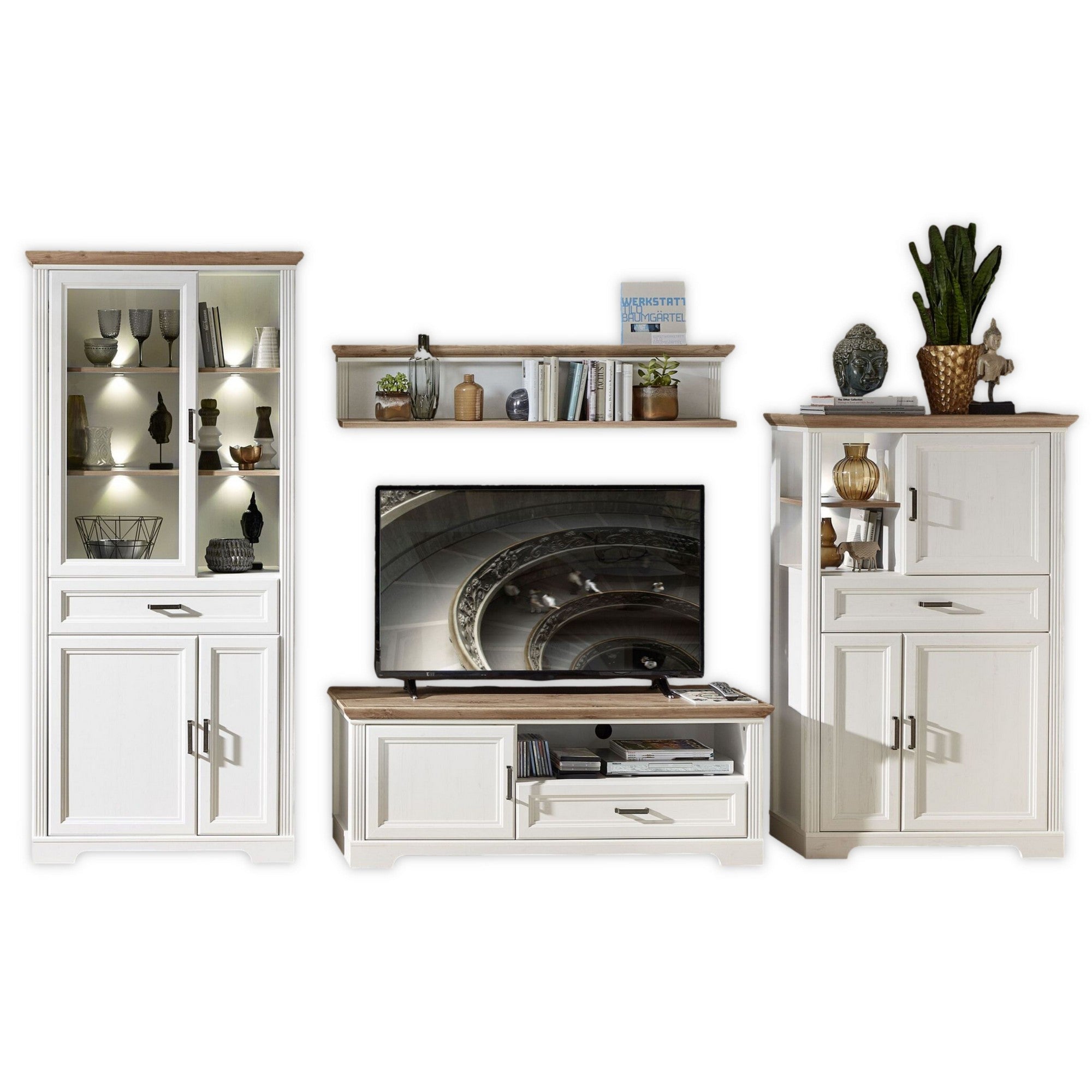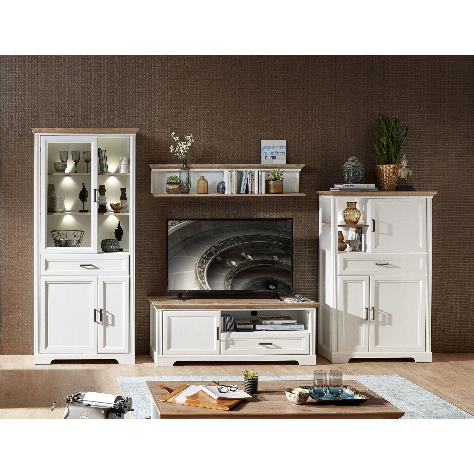 Set living JASMIN 2, alb/stejar artisan, format din 2 comode, vitrina si o polita