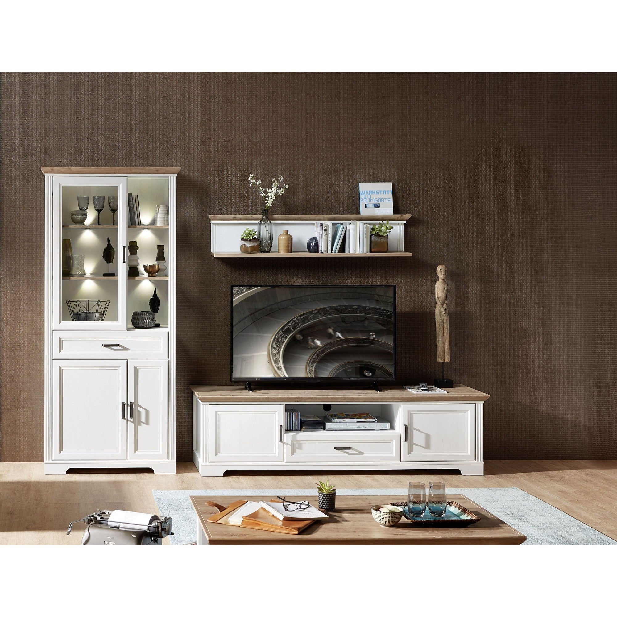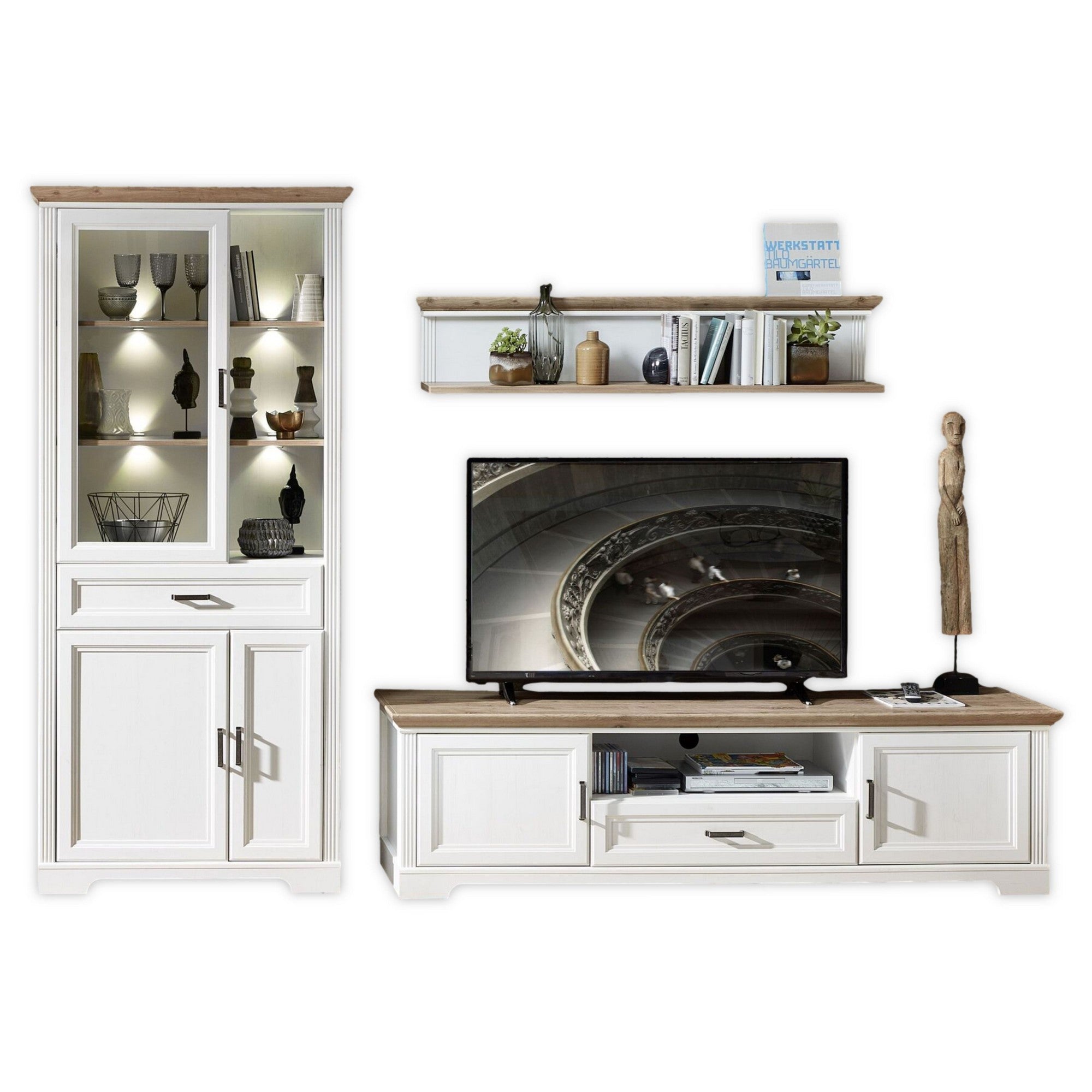 Set living JASMIN 3, alb/stejar artisan, format din comoda TV, vitrina si o polita