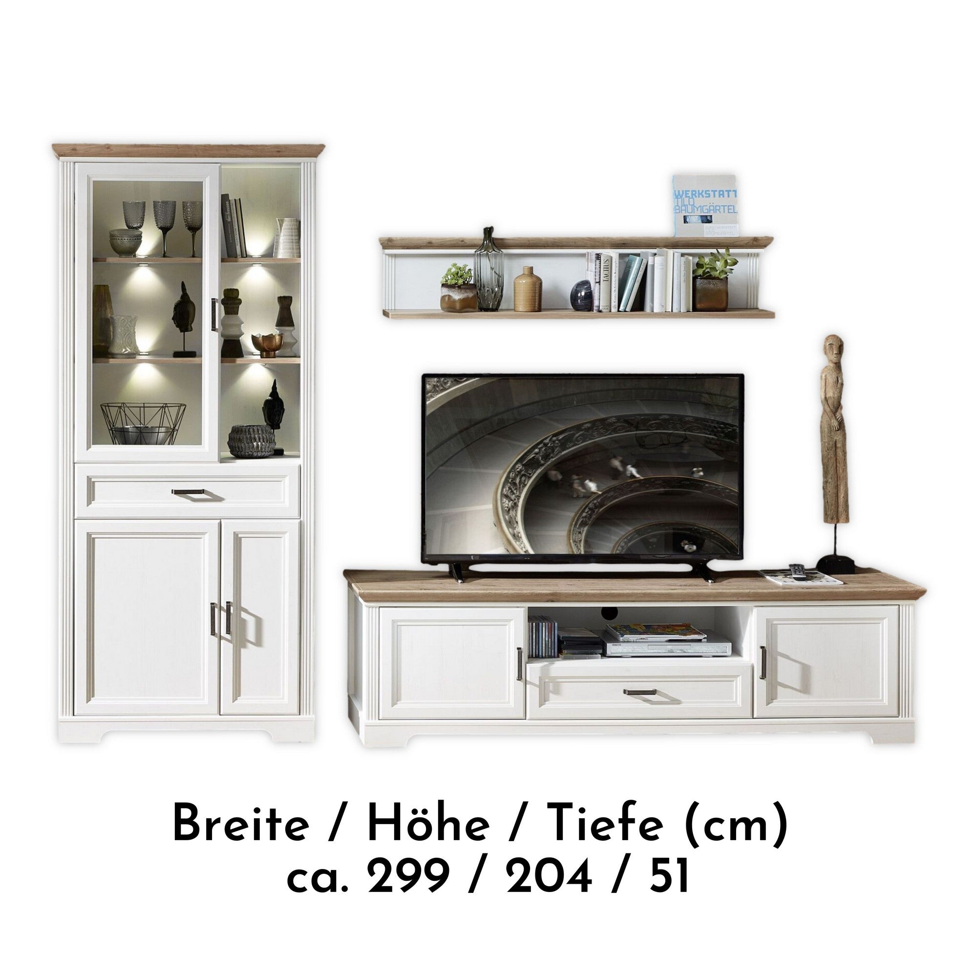 SET MOBILIER PENTRU LIVING JASMIN 3, ALB/STEJAR ARTISAN, PAL, FORMAT DIN: COMODA TV, VITRINA SI O POLITA, 299X51X204 CM