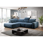 COLTAR MODERN COLOMBO L, SEZLONG STANGA, STOFA CATIFELATA ALBASTRA - PALLADIUM 13, CU SISTEM ELECTRIC DE AJUSTARE A ADANCIMII, STRUCTURA DIN LEMN MASIV SI PAL, SEZUT DIN ARCURI SINUSOIDALE SI SPUMA, TETIERE, SPATAR SI SEZUT REGLABILE, CU SPATIU PENTRU DEPOZITARE, 296X227X81/103 CM