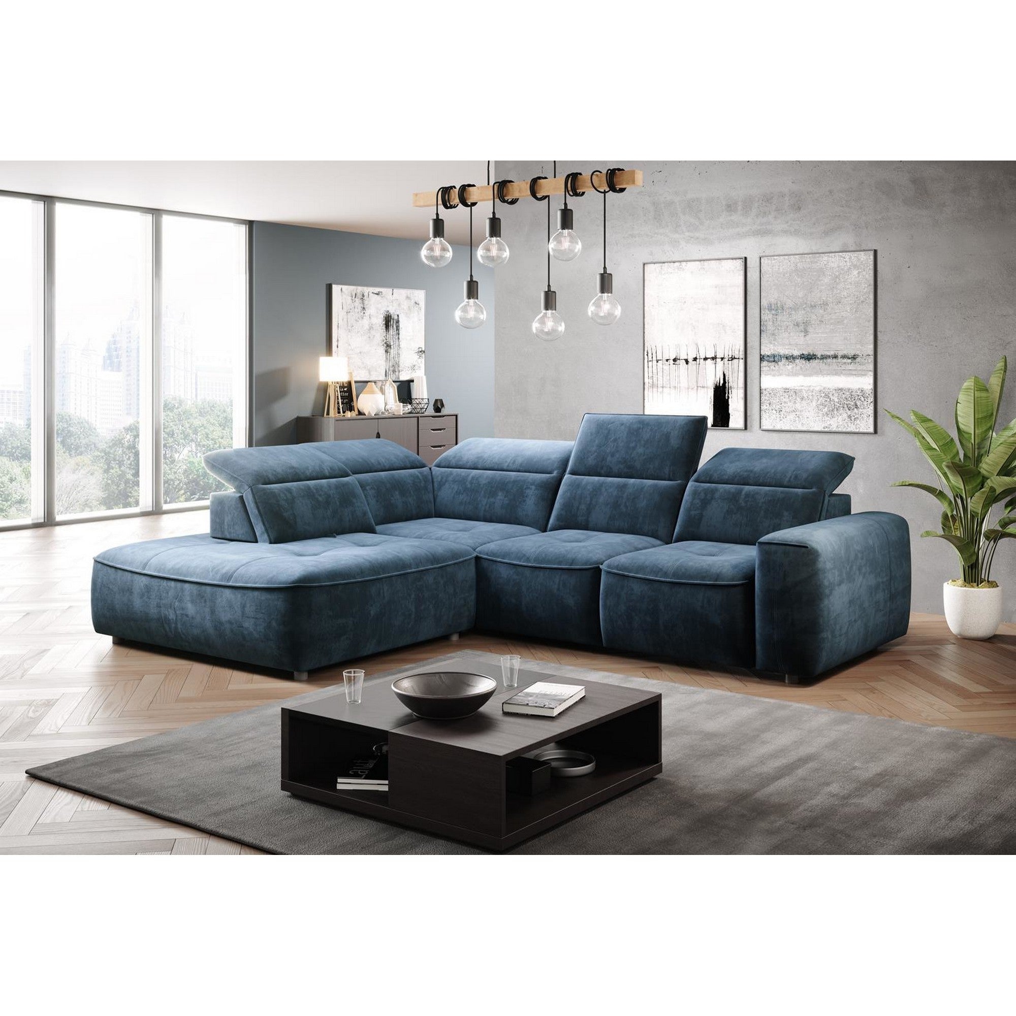 Coltar COLOMBO L, sezlong stanga, stofa catifelata albastra - PALLADIUM 13, 296x227x81/103 cm, reglaj electric, tetiere, spatiu depozitare