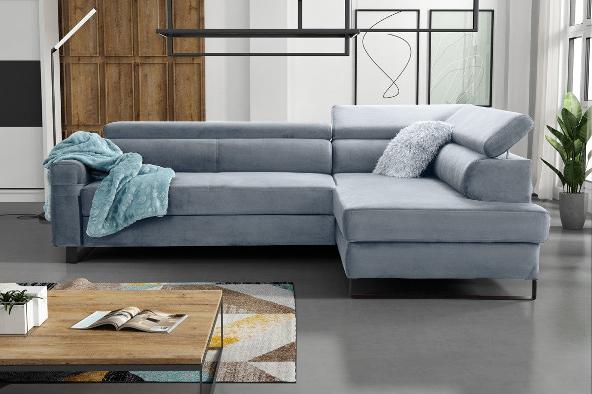 Spatarul coltarului este inalt si prevazut cu tetiere reglabile, fiind perfect pentru relaxare pe timp de zi.