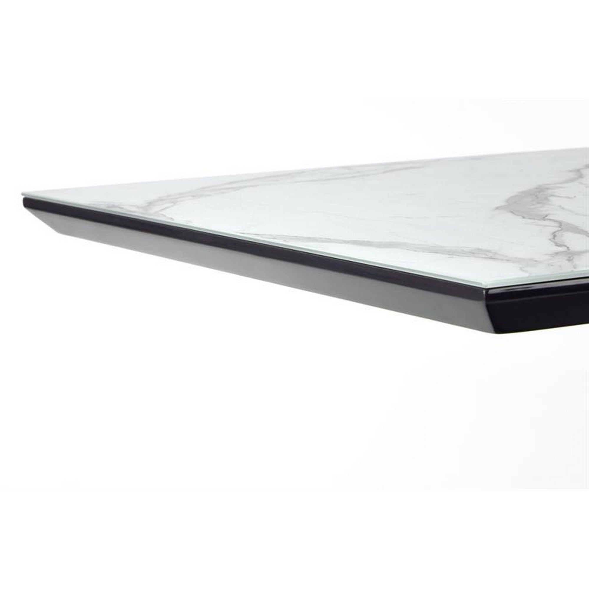 O masa moderna cu functie de pliere, cu blat din sticla cu efect de marmura alba
