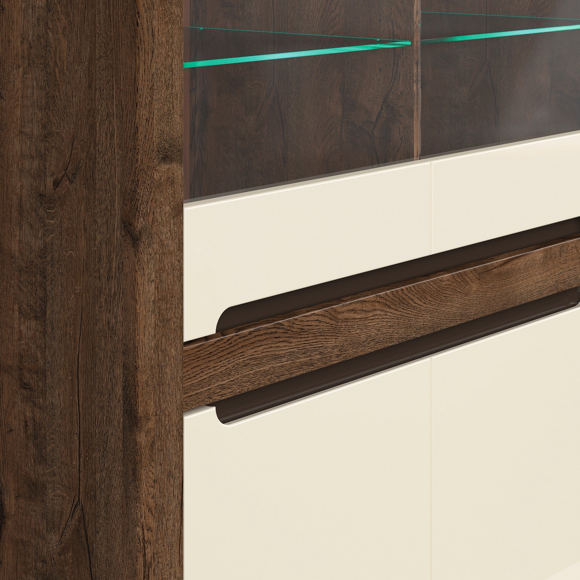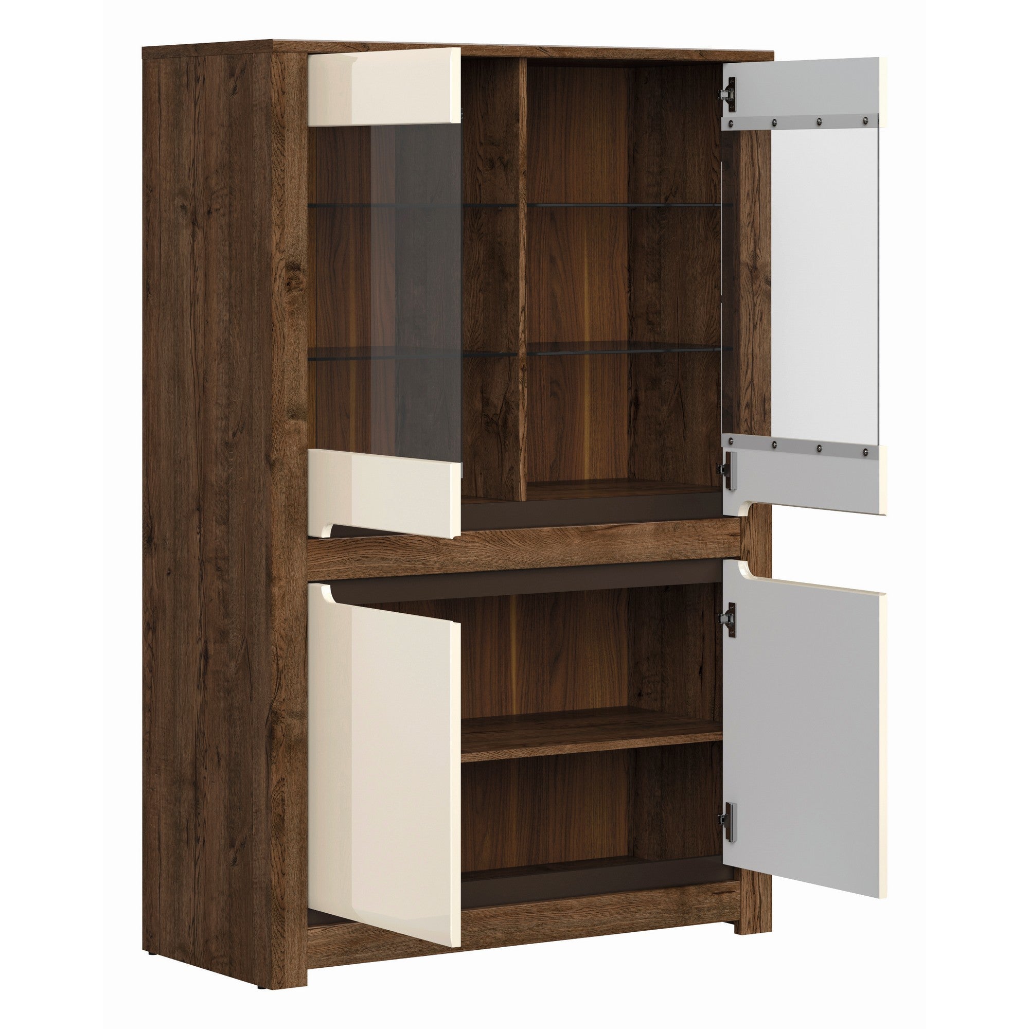 În colecția Ruso se găsesc diferite forme de vitrine si comode, perfecte pentru amenajarea unui living confortabil și spațios. Confortul este oferit de accesoriile de înaltă calitate, echipate cu sistem de închidere silențios. Vitrina foarte spațioasă, este ideală pentru expunerea obiectelor decorative. Opțional se poate achiziționa și sistemul de iluminare cu LED.