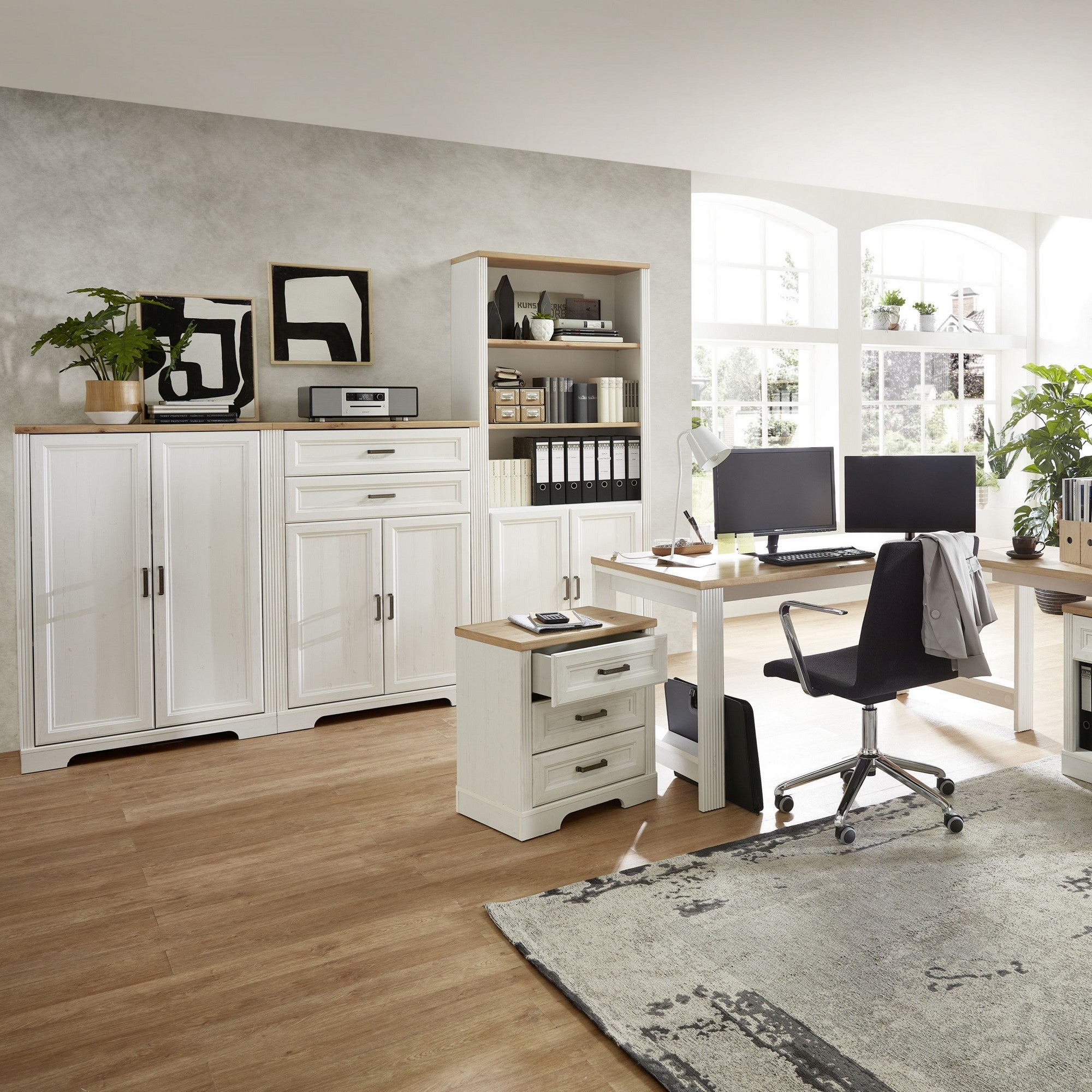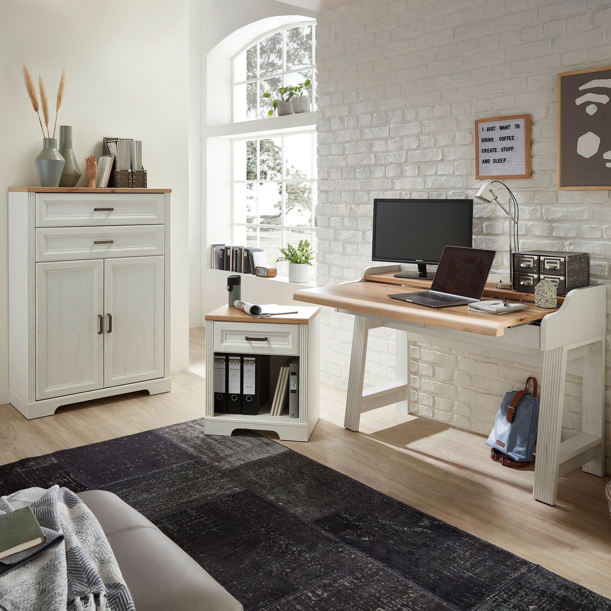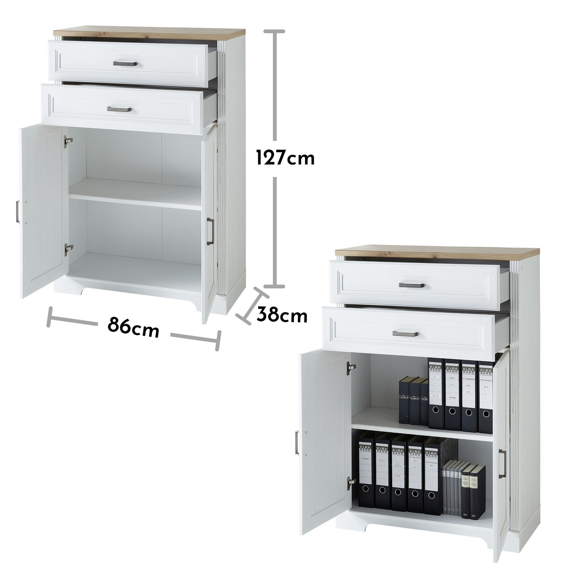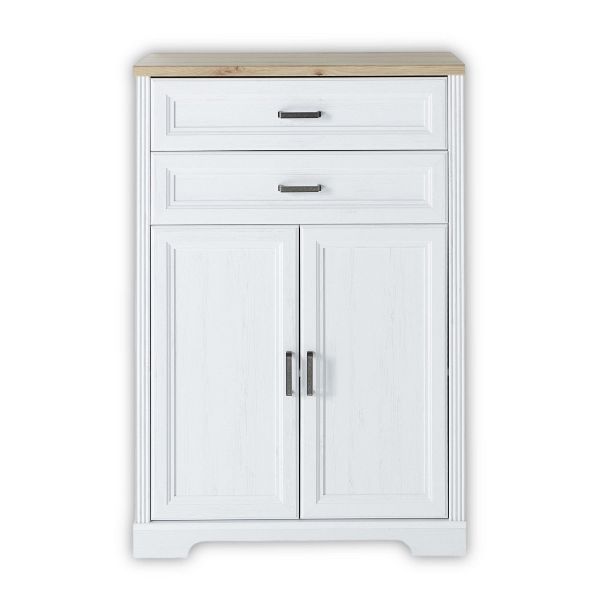 Comoda JASMIN, alb/stejar artisan, PAL, cu 2 usi si 2 sertare, 86x38x127 cm