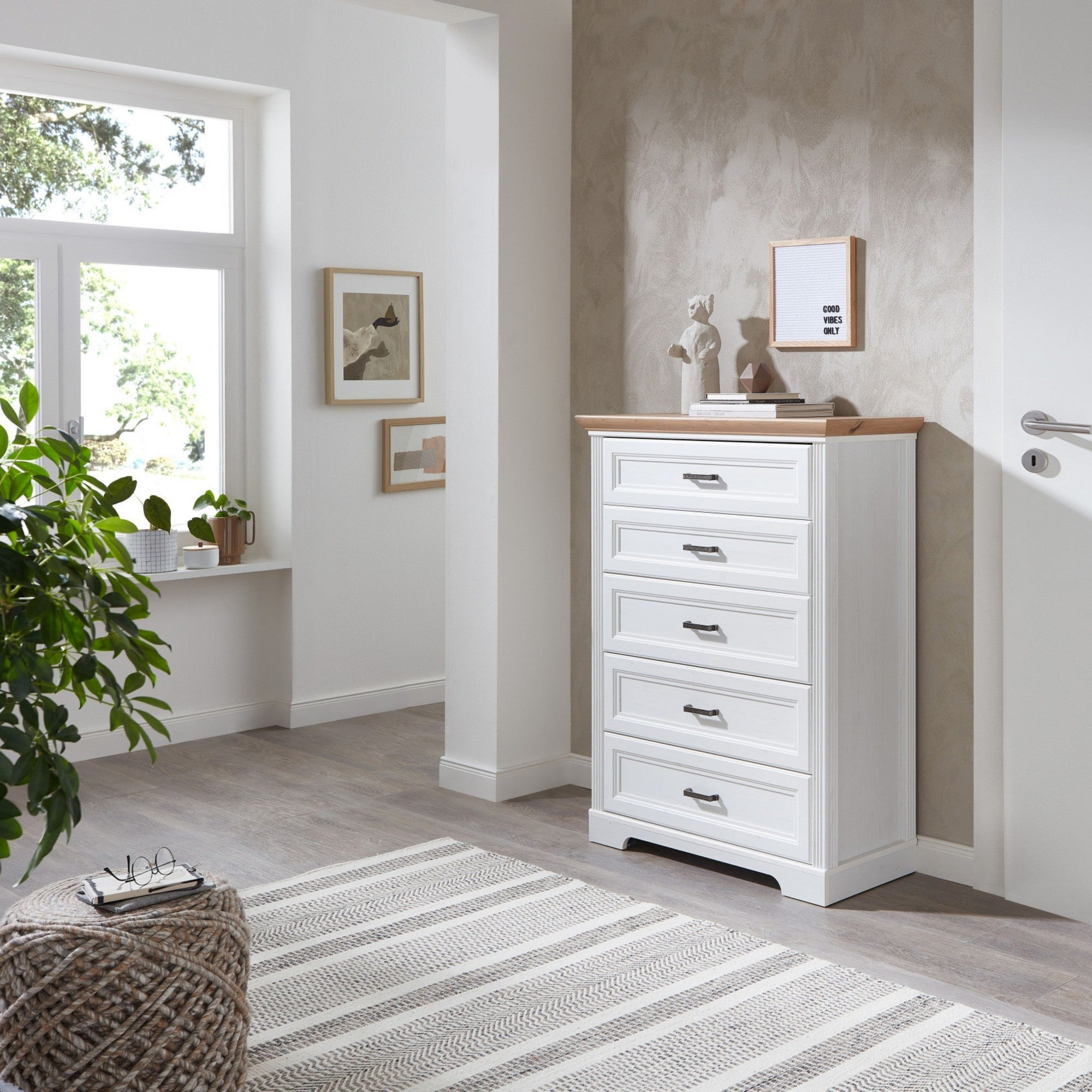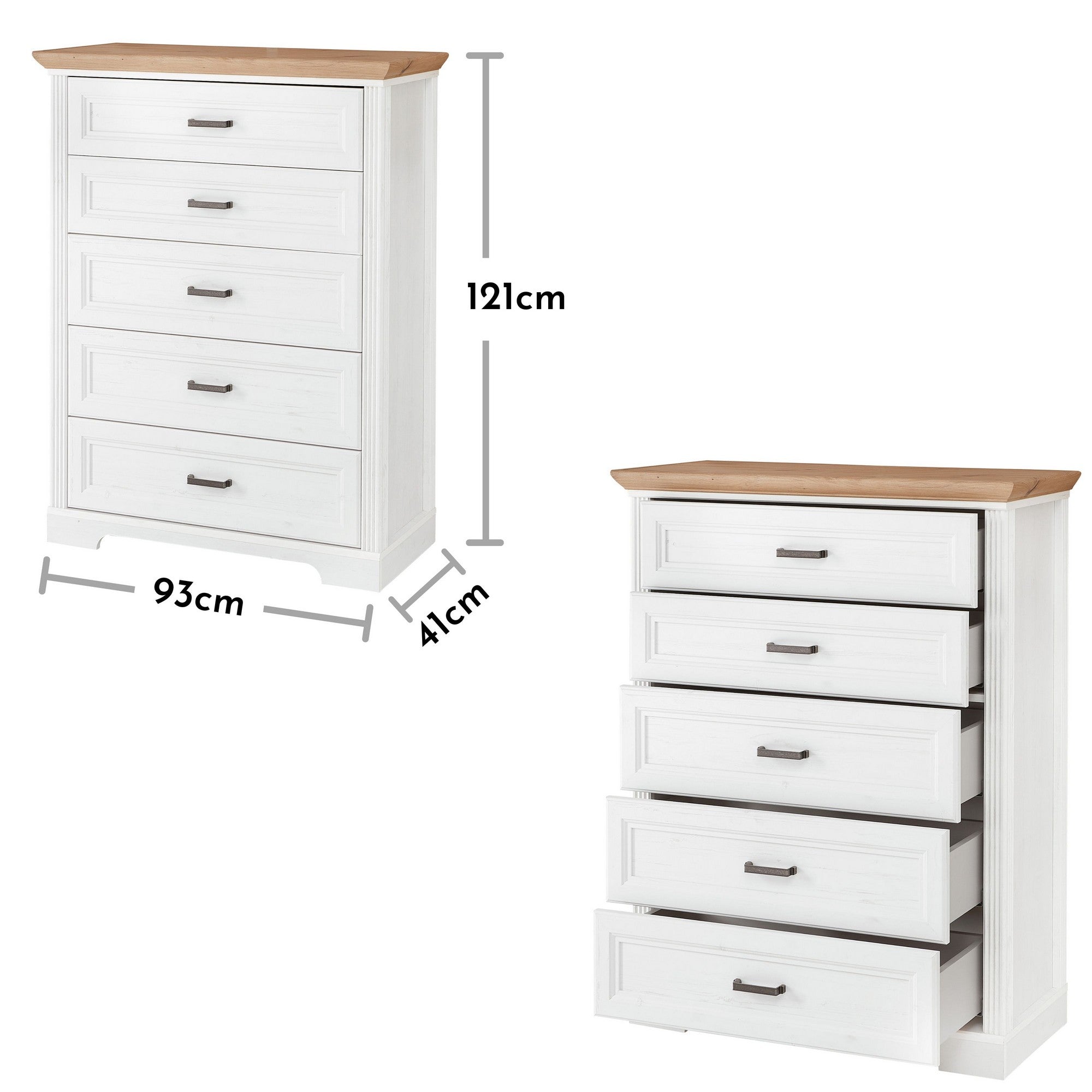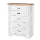 Comoda JASMIN, alb/stejar artisan, PAL, cu 5 sertare, 93x41x121 cm