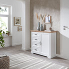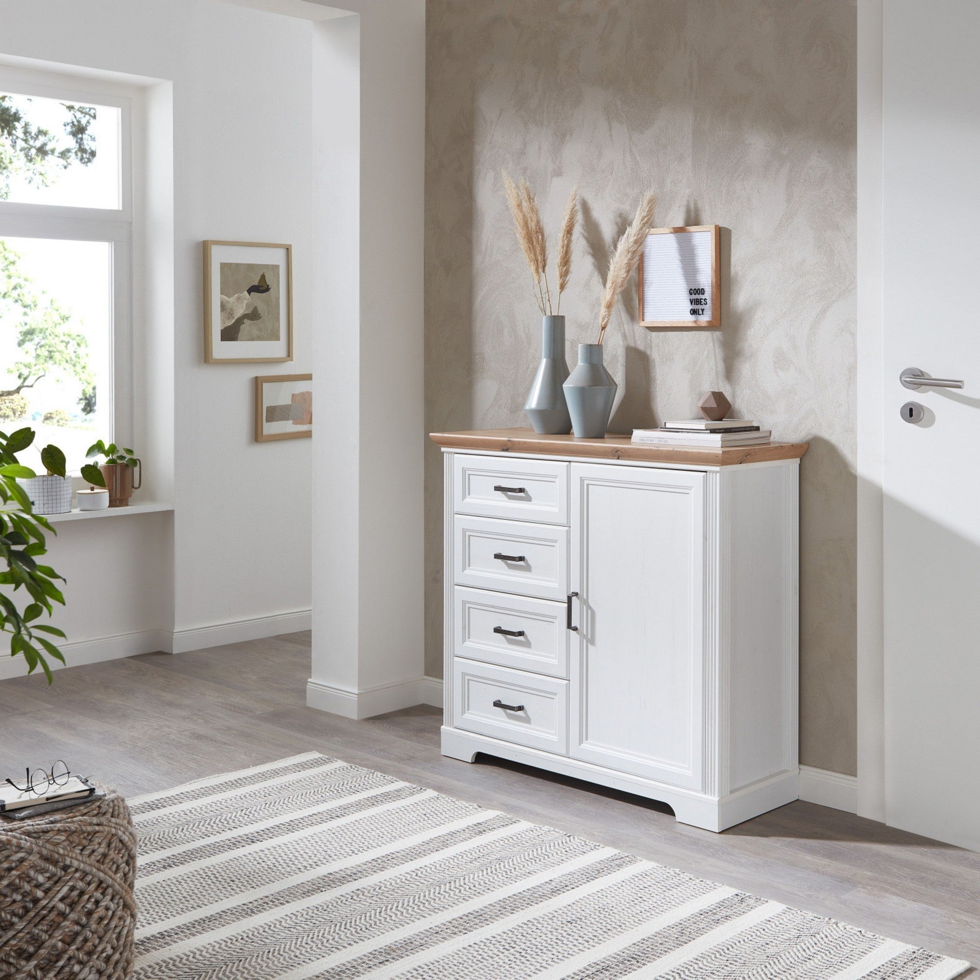 Comoda JASMIN, alb/stejar artisan, PAL, cu o usa si 4 sertare, 115x41x102 cm
