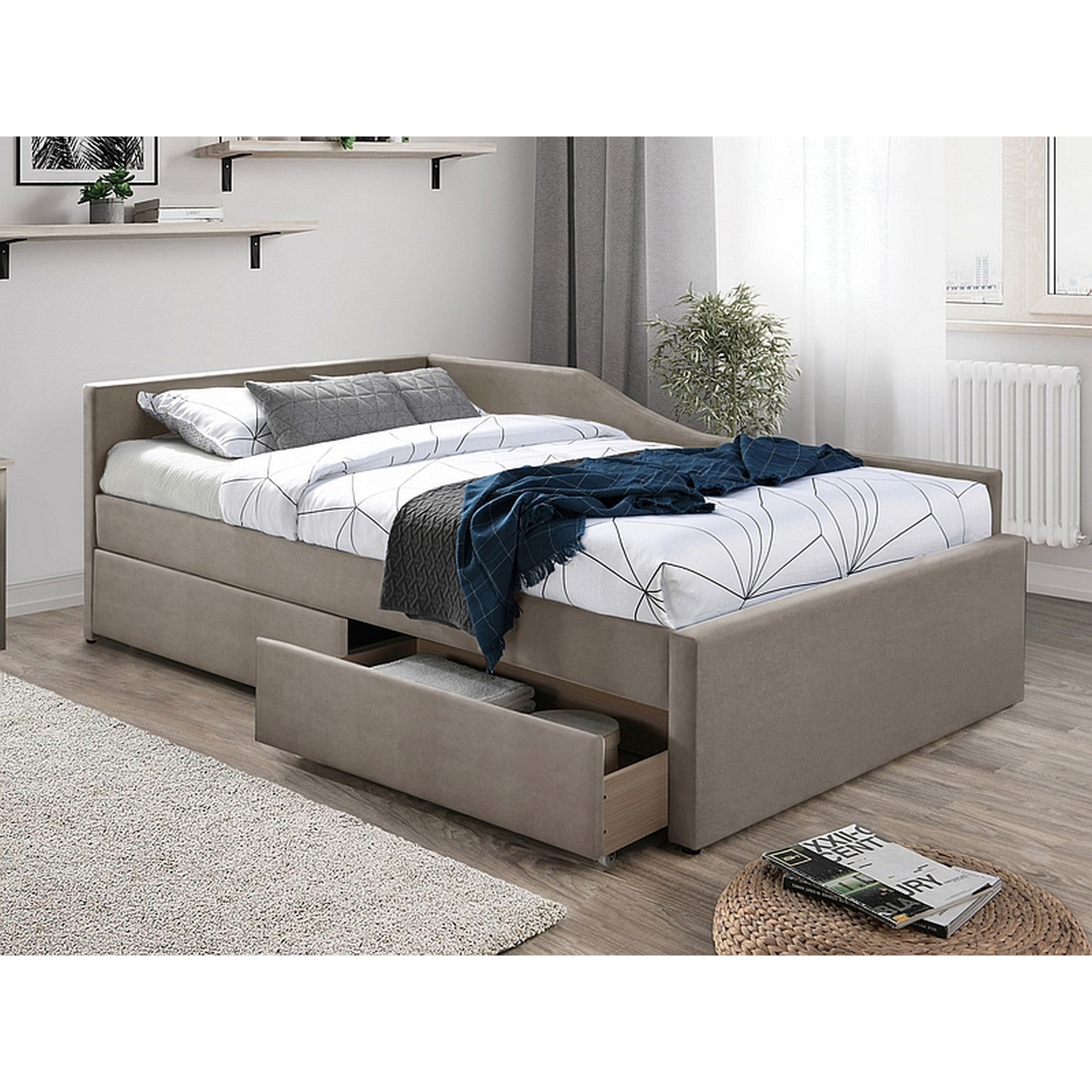 PAT 120X200 ELIOT, BEJ INCHIS, STOFA CATIFELATA/LEMN, CU SPATIU DEPOZITARE, 128X213X75 CM