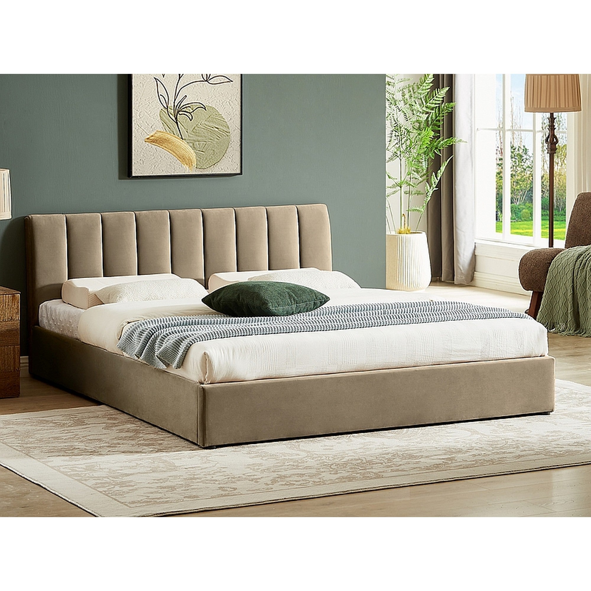 Pat 160x200 MONTREAL, bej, stofa catifelata/lemn, 167x215x79 cm