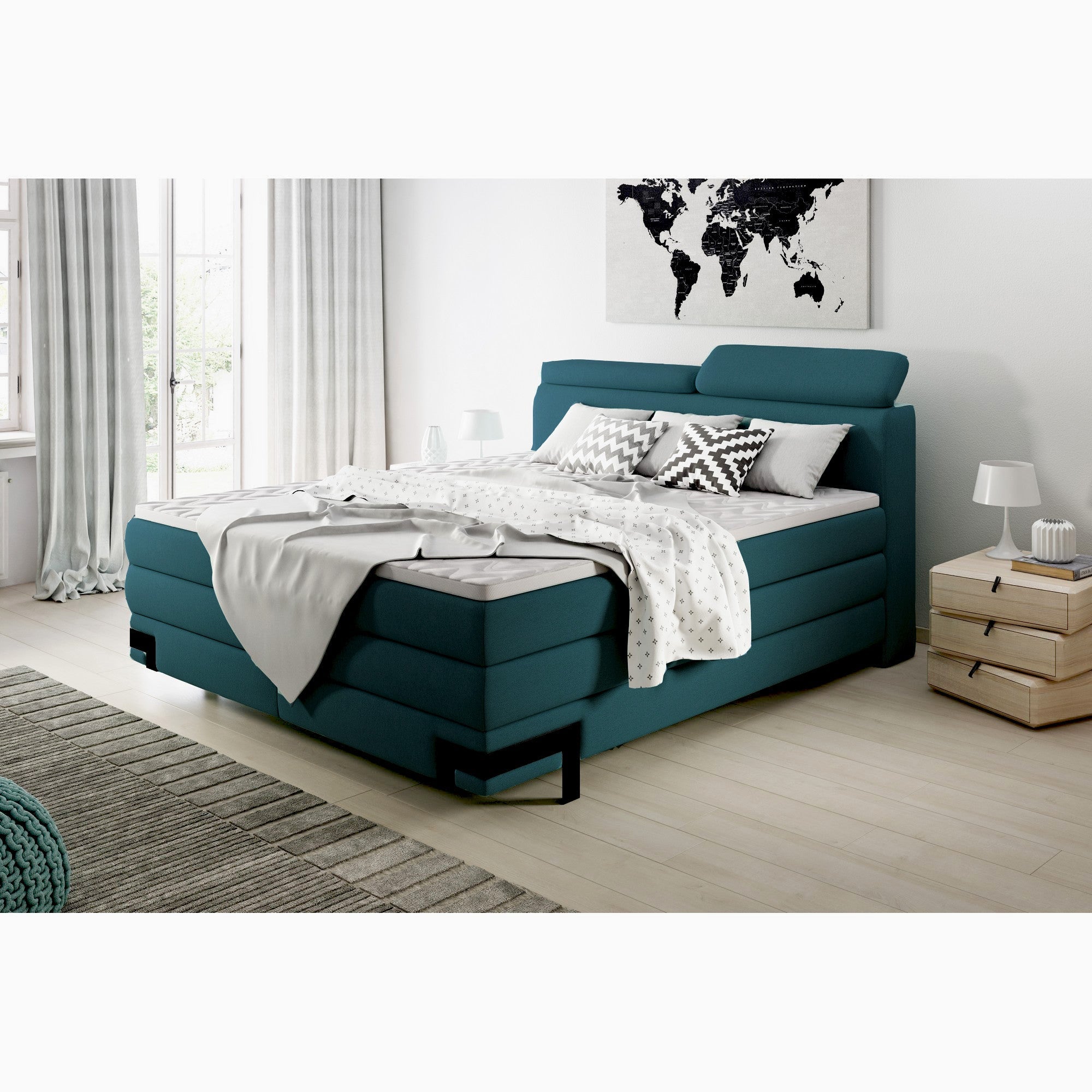 Pat KANO, stofa catifelata albastra - Palladium 14, cu saltea, topper si 2 spatii pentru depozitare, 160x200 cm