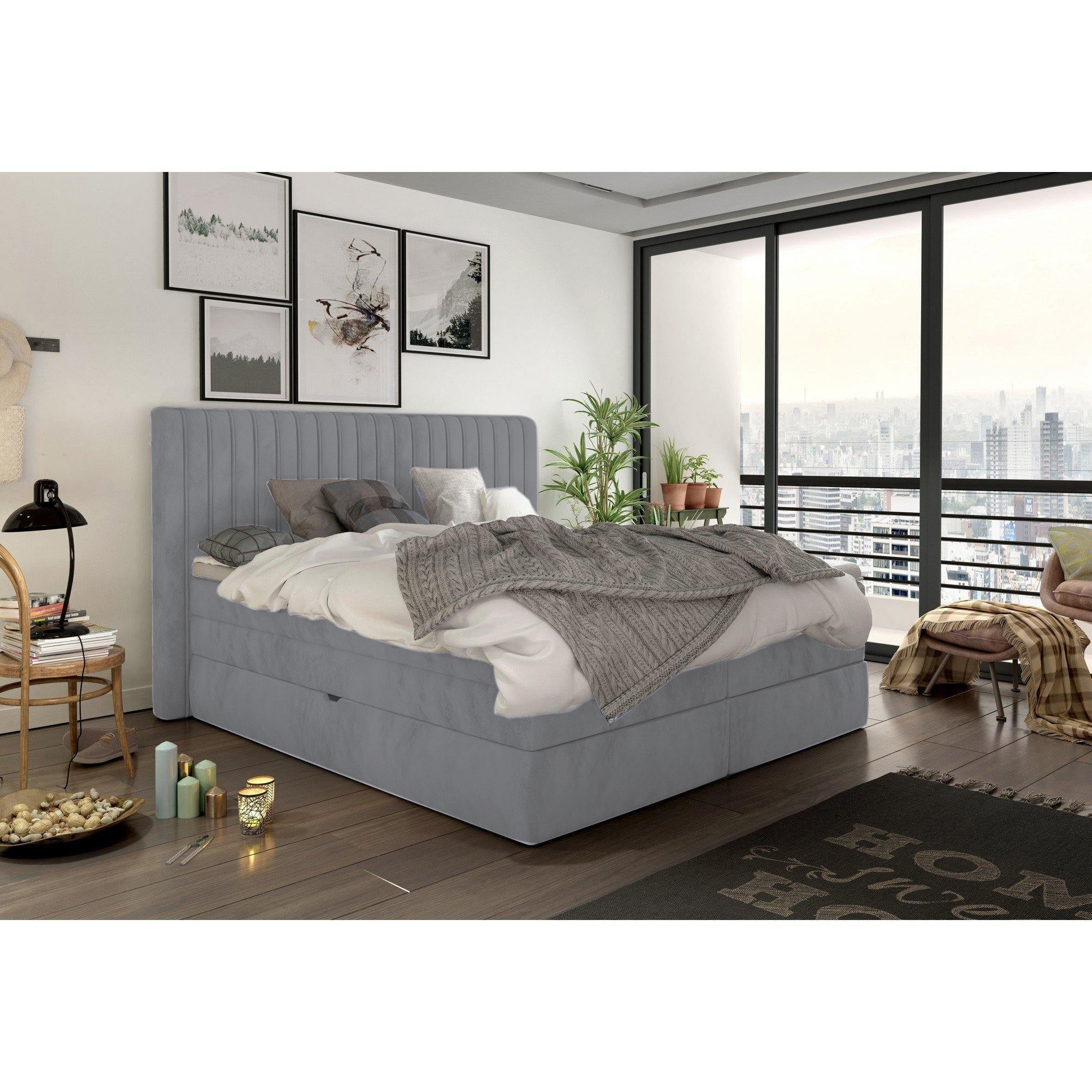 Pat MINOLA 160 boxspring, stofa catifelata gri - Monolith 84, cu saltele, topper 5 cm si 2 lazi pentru depozitare