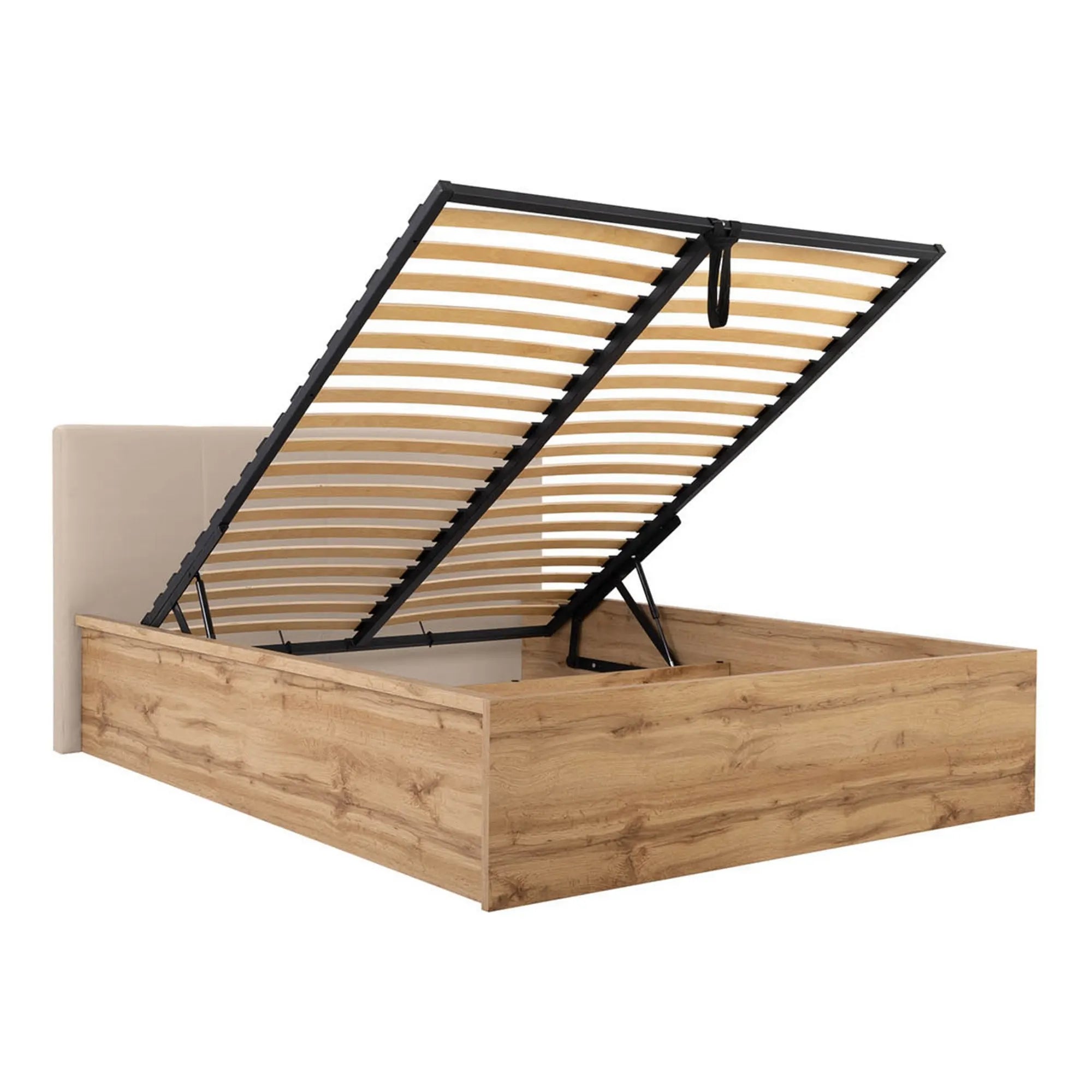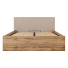 PAT TETRIX 140X200, STEJAR WOTAN/BEJ, PAL/STOFA CATIFELATA, CU SOMIERA SI SPATIU DEPOZITARE