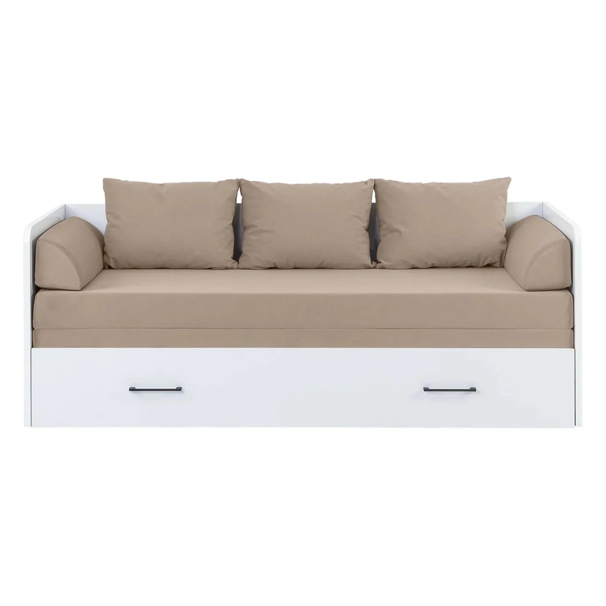 Pat TETRIX 80/160x200, alb/bej, PAL/stofa, cu saltea extensibila si spatiu depozitare