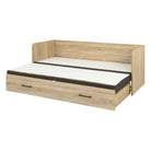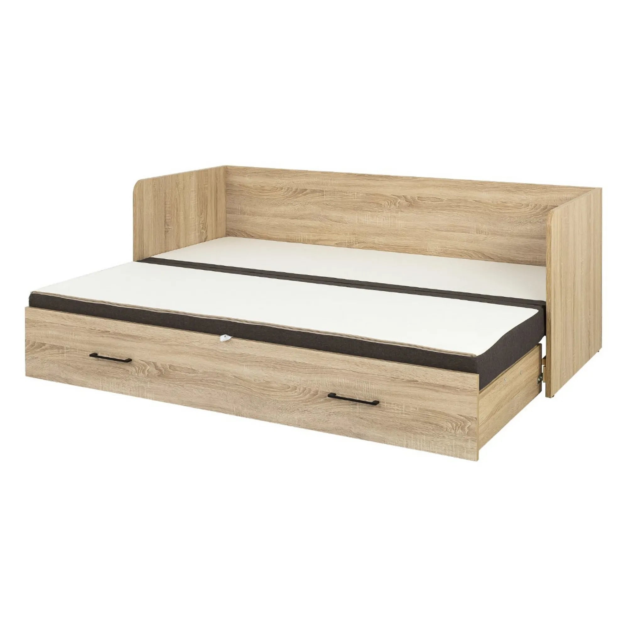 PAT TETRIX 80/160X200, STEJAR SONOMA/MARO, PAL/STOFA, CU SALTEA EXTENSIBILA, 3 PERNE, 2 TETIERE SI SPATIU DEPOZITARE