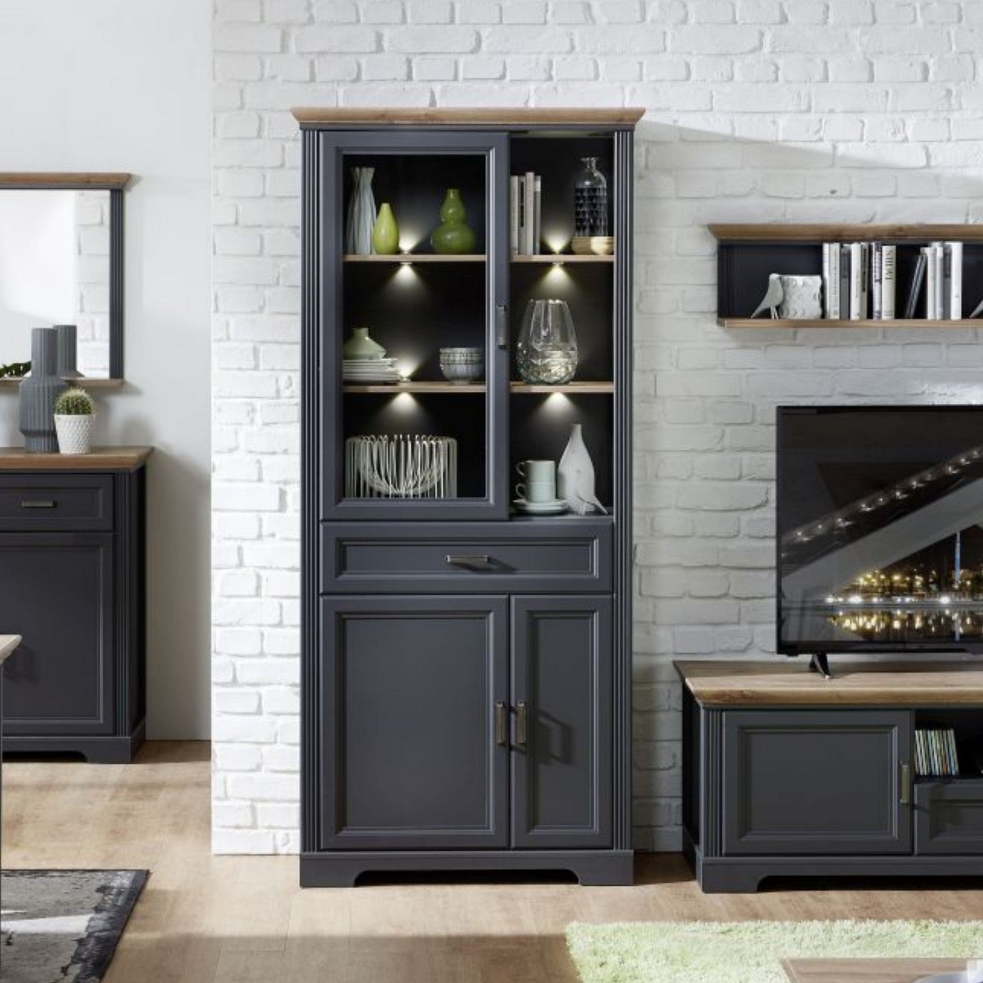 Vitrina JASMIN, gri grafit/stejar artisan, PAL/sticla, cu iluminare LED, 93x42x204 cm