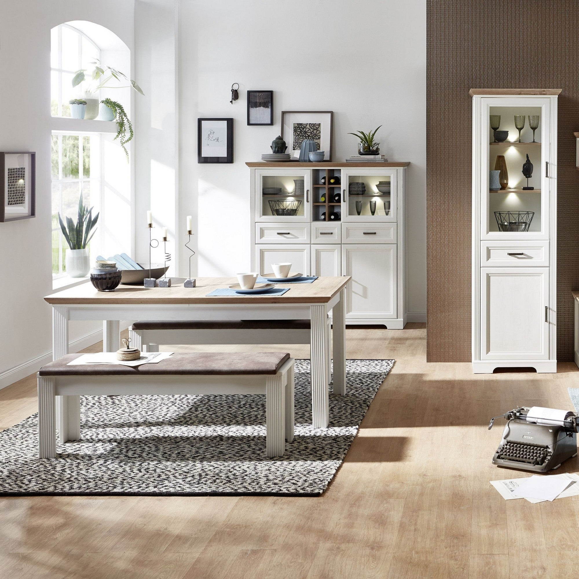 VITRINA JASMIN, ALB/STEJAR ARTISAN, PAL/STICLA, CU ILUMINARE LED, 143X42X150 CM